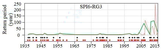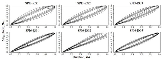 The number of events that occurred in the different regions of Madeira from 1937–2016 ranged from 58 to 65, for SPI3, and from 29 to 35, for SPI6. Despite the smaller number of events for SPI6 comparatively to SPI3 (which resulted in larger interarrival times), the and values indicate worse drought conditions. The Kendall’s correlation coefficient presents very high values (higher than 0.80) which are in accordance with dependence visible in the scatter plots of Figure 8. However, such coefficient measures only the overall strength of the association between and , but does not give information about how such association varies across the distribution []. The higher Kendall’s for SPI6 denotes a stronger correlation between and . The mean values of and suggest, for SPI3, regions with similar characteristics, while for SPI6, the values for RG3 are higher. However, these findings are quite vague because they are based on a univariate appraisal which justifies a copula-based characterization of the dependency structure between and , presented in the next sections.
