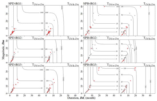 Due to the multivariate nature of droughts, Shiau [] proposed a methodology that categorizes the return periods of bivariate distributed hydrological events as joint and conditional return periods. The joint drought duration and magnitude return periods can be defined in two cases: return period for or and return period for and , as described by Equations (9) and (10), respectively: