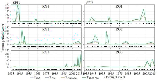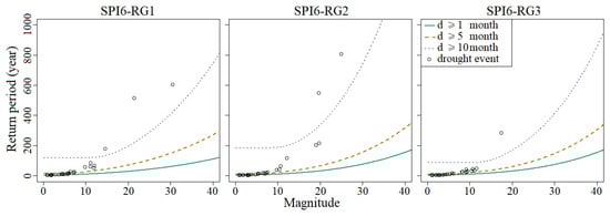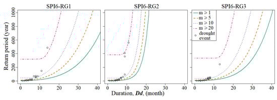 Similarly, the conditional return periods can be defined for two cases: the return period of drought duration given drought magnitude exceeding a certain threshold , and the return period of drought magnitude given drought duration exceeding a certain threshold . These conditional return periods are calculated by Equations (11) and (12):