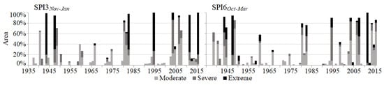 At given location, the SPI quantifies the observed rainfall as a standardized departure from a selected probability distribution function that models the raw rainfall data for the timescale of interest, from 1 to 48-month or longer (1, 3, 6, 9, and 12-month are the most common timescales []). The rainfall data are fitted to a probability distribution function, which is then transformed into a normal distribution so that the mean SPI for the location and desired timescale is zero []. Negative SPI values represent rainfall deficit, whereas positive SPI values indicate rainfall surplus.