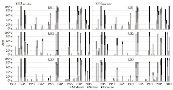 Also, for RG3, Figure 7 enables a closer look at the drought characteristics. For both SPI timescales, it shows that for the unsmoothed SPI series there is a higher number of 1-month droughts; however with smaller magnitude which can make the drought analysis biased and, therefore, less representative. As the running length increases, the number of drought events decreases, while and increase. The smoothed regionalized series always allow the recognition of the more severe droughts with longer duration and higher magnitude. On the basis of these findings and of those from the factor analysis, the smoothed SPI series, whether at the rain gauges (non-regionalized) or regionalized based on , for SPI3, and on , for SPI6, have been selected in pursuing the study based on copulas.