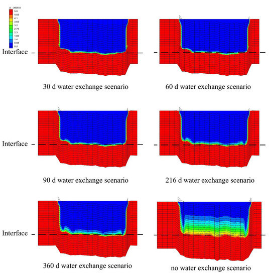 Figure 5 shows the salinity distribution in the water and sediment surfaces of the section shown in Figure 1 at the end of simulation period under six water-exchange scenarios for Yuehu Lake. These results indicated that more frequent water-exchange maintained a lower salt concentration near the sediment–water interface. At the same time, more frequent water-exchange also promoted salt release from the sediment. The simulation results suggested that a 30 d water-exchange scenario had the greatest impact on expediting salt release from the sediment, whereas no water-exchange scenario had the highest sediment surface salt concentration at the end of the simulation period. Water-exchange effectively reduced the salt concentration at the sediment surface and controlled surface water salinization.
