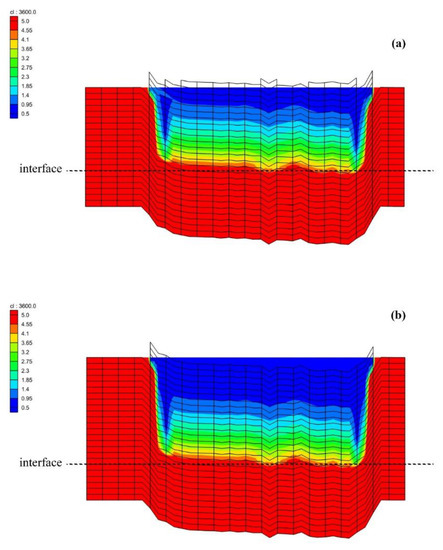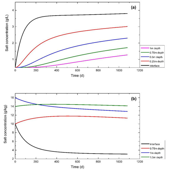 Figure 6 shows the salt concentration distribution for the lake stages of 2.0 m and 1.0 m at the end of the simulation period. The salt capacity of water is related to salt solubility, therefore, salt release is impeded when the salt capacity of the water is maximized and the concentration gradient is too small to advance additional salt release. The salt concentration distributions for the lake stages of 2.0 m and 1.0 m were nearly identical, meaning that salt release from the sediment was not impeded and the salt capacity of the lake water was not maximized during the simulation period. For low-permeability areas like this one, the efficiency of sediment salt release related primarily to the water/sediment concentration gradient. Water thickness had little influence on sediment salt release before the salt capacity of the water was maximized. Salt release from sediments is a long, slow process in low-permeability areas.
