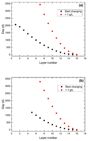 The salinity index of freshwater in a human-living area is less than 1 g/L. The time at which the change started and became greater than 1 g/L of the average salt concentration in water at each layer is shown in Figure 11. The water depth was divided into 16 layers, with the 16th (0–0.25 m from the interface) layer adjacent to the sediment. From that layer to the 6th (2.5–2.75 m) layer, the time at which change time started was the same in both scenarios. Salt concentrations began to change on day 1194 under the lake stage of 1.0 m, 18 days earlier than the lake stage 2.0 m scenario at the 5th layer. The time taken for the average salt concentration to become greater than 1 g/L was same as these two scenarios from the 16th (0–0.25 m) to the 10th (1.5–1.75 m) layer. The times taken for the average salt concentration to become greater than 1 g/L of the 9th (1.75–2 m), the 8th (2–2.25 m), and the 7th (2.25–2.5 m) layers were the 2145th, the 2703rd, and the 3303rd day under the 1 m scenario, which are 3, 57, and 132 days earlier than 2 m scenario. The average salt concentrations of the layers above the 7th layer was not greater than 1 g/L at any time during the simulation period. In short, the influence of salt release from the sediment to water increased with time, and the salt capacity of the lake was much higher than the amount of salt released to the lake. Because of the low molecular diffusion from the sediment, salt transport was weak. Salt in the first layer rapidly released into the water, so the salt concentration of the first layer stayed relatively low during the simulation period. Though the supply from the lower layer reached the first layer, the supply also released quickly into the water and reached equilibrium.