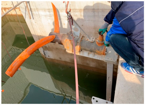 The flow rate boundary condition was assigned at the inlet with the value of 1331.11 kg/s, while the zero pressure was set at the outlet. The symmetry boundary condition was adopted at the water surface. The no-slip boundary conditions were applied in the bottom surface, side wall, bracket, and curved wall. The wall surface was cement, and the surface roughness was set as 0.5 mm based on the test condition and our previous work of simulation []. The finite volume method was applied to discretize the governing equations. The second-order central difference scheme was adopted in the diffusion term, and the second-order upwind style was used in the convection term. The SIMPLE algorithm was used in the coupling process of speed and pressure. For the unsteady simulation, the blades rotated one degree per time step.