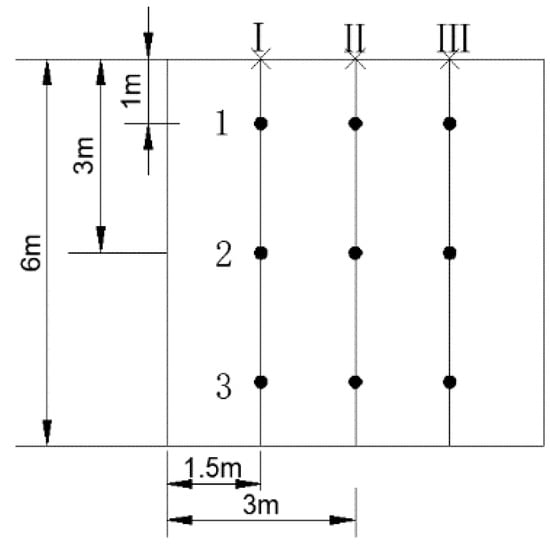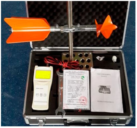 In order to describe the distribution of velocity in the flow field, 9 measuring points were spaced in each of the 12 sections encompassing the ditch, as indicated in Figure 3. The flow-velocity measuring instrument adopted an LJ20A-type convenient tachymeter with OA-type fiber-optic rotor sensor, as shown in Figure 4 [,]. The diameter of the tachymeter is 15 mm, and the measuring range is 0.01–4.00 m/s, whilst the measuring error is less than 1.5%. The tachymeters were installed side-by-side within a row on the measuring bracket, as shown in Figure 5. These were equipped with both a standard positioning and a lengthened rod. Different flow field points were obtained by changing the position of the measuring bracket. Following a new positioning of the tachymeter, it was necessary to wait for the flow velocity to be stable at a certain value. Once the data was recorded for 20 sets, the bracket was moved to another plane for further measurement.