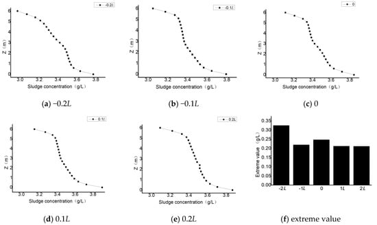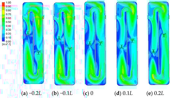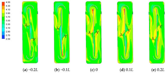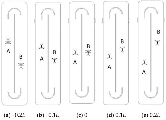 The inlet sludge concentration was set as 3.5 g/L, and the rotating speed of the propeller was 81 r/min. The distribution of the propellers was controlled by changing the longitudinal distance (∆L) between the two propellers, assuming (∆L < 10 m for a proper ditch operation [,]. Five schemes were studied: −0.2L (a), −0.1L (b), 0 (c), 0.1L (d), 0.2L (e), as shown in Figure 7.