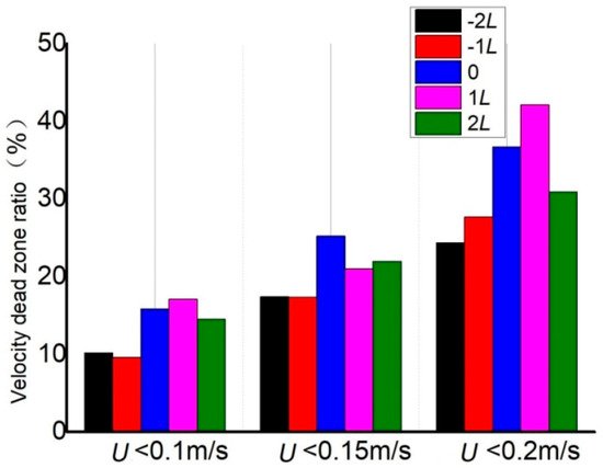 In order to quantify and analyze the pros and cons of each scheme, the dead zone rate of different schemes was calculated using a histogram chart of velocities less than 0.1, 0.15, and 0.2 m/s, as shown in Figure 9. In the present report, the term dead zone rate refers to regions with velocities falling below the criterion for significance in the flow field characteristics.