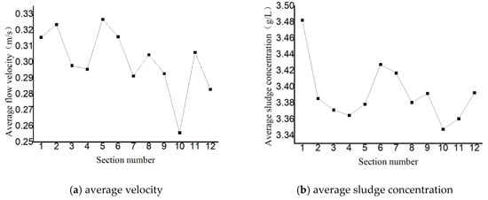 The results, as presented in Figure 12, show a scatter trend of the average velocity and sludge concentration at each section. The most surprising aspect of the data was the dissociation of high velocity areas with high sludge concentrations. These differences can be explained in part by the proximity of the section with interferences in the flow. For example, the sections (1, 7–9) close to the propeller have a high velocity, a scatter flow pattern, and low sludge concentration. However, section 1 is located below the inlet of water flow, and its flow pattern is disordered. The increased sludge concentration at the bottom of the inlet side accords with findings of Section 3.2. The curved wall (section 6) augmented these two parameters, as a result of the flow direction. At the propeller’s wake, the average velocity and sludge concentration decreased in sections 2–4. Through the strong guidance of the curved wall, the flow increased in speed, and thus, the sludge concentration was low (sections 5 and 11). The outlet changed the flow direction, resulting in the dead zone flow (section 9); thus, the sludge concentration was high. At the back of the outlet (section 10), since water and sludge flow out from the system, the average flow velocity and the sludge concentration were small. Because the incoming flow impedes the movement of water at the second curved wall, the average velocity was small in section 12.