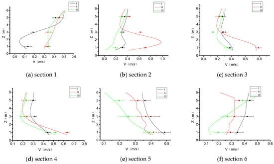 As can be seen from the first curve’s velocity pattern (section 5, Figure 14b), the water, resulting from inertial and centrifugal forces, strikes the wall, and thus, a vortex occurs. The high-speed flow driven by the propeller goes upwards after hitting the diversion wall at the bottom, so the flow velocity in the plane increases from the top to the bottom in Row I. The measuring points in Row II are close to the curved wall, so they are strongly influenced by the forced diversion; therefore, the flow velocity at these points fluctuates. The velocity at measuring points Row III is relatively lower than Row II. Under the strong influence of the curved wall in section 6, the water flow is accelerated by the propeller and then diffuses to the upper part. The velocity distribution is lower in the low part and higher in the top part.