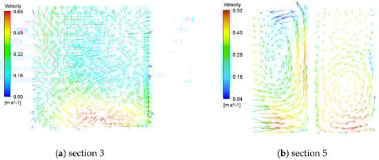 To better understand the propeller’s influence on the flow, predictions of velocity vectors are made for sections 3 and 5 (Figure 14). It could be seen that the flow velocity in the lower part is the highest, and the spiral flow formed strikes the curved wall, but then it collides with the upper water flow, resulting in a decreased velocity near the middle-curved wall. Since section 4 is located at the inlet of the first and second curve and is far away from the propeller, the flow pattern is seen as more stable. The flow’s velocity decreases and then increases from top to bottom of the channel.