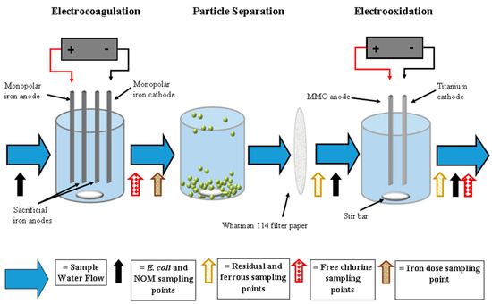 Following EC, the electrodes were removed and flocculation, settling, and filtration were implemented to separate the iron flocs. The particle separation process was modified from Vepsäläinen et al. (2009) [14] to include 10-min flocculation at 60 rpm followed by 15-min sedimentation with no mixing. A sample of approximately 150 mL was slowly pipetted from the center of the reactor to avoid collecting flocs and was subsequently passed through Whatman 114 filter paper (pore size = 25 μm) via vacuum filtration. The large 25-µm filter was applied during particle separation to allow E. coli cells to pass through the filter when EC was not applied (as shown in Section 2.5). This ensured that E. coli mitigation was only due to the addition of EC and was not a result of filtration alone. The filtrate was transferred to a sterile reactor for EO treatment, and the pH was measured.