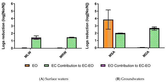 As shown in Figure 2, EC alone accounted for ≈1 to 2 logs reduction of E. coli in the various model waters. The model groundwaters experienced higher E. coli mitigation than either surface water. Statistically greater E. coli mitigation was achieved in the model deep aquifer compared to the model lake water and model river water (p = 0.0043 and 0.0167, respectively). The limited removal of E. coli in the two surface waters could be attributed to competition between NOM and E. coli. NOM removal occurred in both surface waters, with significantly more removal in the model river water (61.7 ± 7.8%) compared to the model lake water (8.2 ± 4.1%). This could be a result of the higher initial concentration of NOM in the model river water (data shown in Appendix A, Table A1). Notably, previous studies have reported mixed findings in the influence of NOM on microbial attenuation during EC. Tanneru and Chellam (2012) [46] observed inhibition of virus removal with increasing NOM while Delaire et al. (2015) [8] reported no significant interference in bacterial removal.