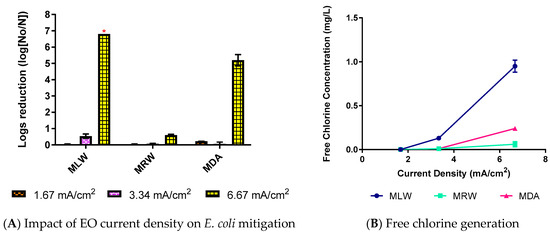 An EO current density of 1.67 mA/cm2 was insufficient to reduce E. coli concentrations in the model waters, apart from the model shallow aquifer (Figure 2). High E. coli mitigation in the model shallow aquifer was most likely due to the water’s high chloride concentration (70.4 mg/L Cl−), which was five times greater than the next highest chloride concentration. The higher chloride concentration resulted in greater free chlorine generation (0.074 ± 0.008 mg/L, data shown in Appendix A, Table A1). To assess the impact of increased free chlorine generation in the other waters, higher current densities were tested. The EO current was doubled and quadrupled in the model lake water, model river water, and model deep aquifer, as shown in Figure 3. The model shallow aquifer was not included in these tests as substantial E. coli mitigation was observed at lower current densities (Figure 2). Similar to other investigations [25,45], the increased current led to higher free chlorine production and greater E. coli mitigation.