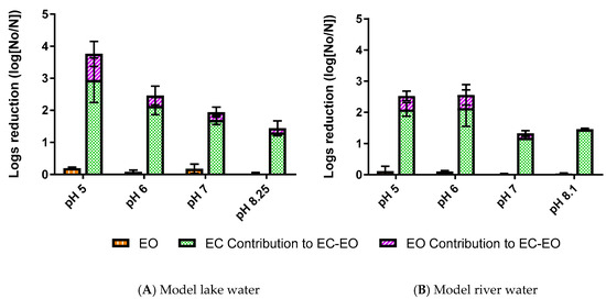 E. coli mitigation by electrooxidation (EO) alone and sequential electrocoagulation (EC)-EO (shown as a stacked bar to illustrate the EO and EC contributions to the sequential process) as a function of initial pH conditions in surface waters: (A) model lake water and (B) model river water. The operating parameters were EC at 10 mA/cm2 for 5 min and EO at 1.67 mA/cm2 for 1 min. Each bar represents the average of triplicate tests, with ±1 standard deviation shown by the error bars.