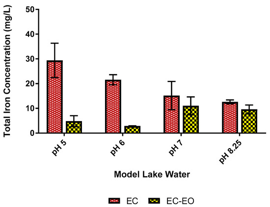 EC-EO with pH adjustment may have been impaired by high total residual iron concentrations. Ferrous iron is more soluble at a lower pH than at the baseline condition of pH 8.25; as such, it may pass through the filter during particle separation and increase EC total residual iron [37]. Indeed, Figure 5 shows that total residual iron concentrations increased with decreasing pH in the model lake water. At pH 6 and 8.25, the fraction of total iron in the ferrous iron form was 40 ± 5% and 7 ± 1%, respectively. The higher ferrous levels at lower pH may have contributed to increased consumption of free chlorine during EO, which would detract from E. coli mitigation. This may help to explain why EC-EO did not show more dramatic improvement over EC alone.