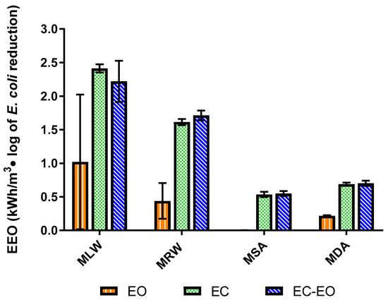 The electrical energy efficiency for E. coli mitigation using each electrochemical treatment was analyzed using the electrical energy per order magnitude reduction (EEO) metric [43]. The average voltage during each test was used to compute the power input to each treatment.