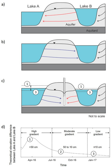 The above-mentioned water table monitoring program also demonstrated that the water level in Lake A was significantly higher than in Lake B during springtime from 2012 to 2016 (i.e., up to 1 m water level difference). This is due to the intermittent hydraulic connection between Lake C and Lake A and supporting surface water inputs into Lake A (see Section 2.1). Under such hydraulic conditions, the direction of groundwater flow into the bank is reversed, i.e., from Lake A to Lake B (Figure 2b).