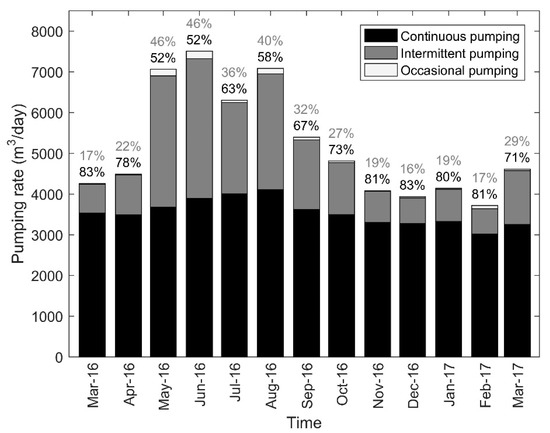 Monthly mean total pumping rate from March 2016 to March 2017. Above each bar are the proportions of the total pumped volume supplied by the continuously (in black) and intermittently (in grey) pumping wells. The occasionally pumping wells supply only <1–2% of the total pumped volume.