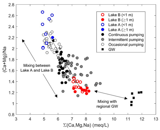 Figure 7 shows the relationship between (Ca2+ + Mg2+)/Na+ and cationic content (i.e., sum of major cations) for Lake A, Lake B, pumping wells, and regional groundwater. Potassium (K+) was excluded from these calculations since only a few samples were analysed for K+ and concentrations in K+ only represent a small fraction of the total cation content (i.e., approximately 1.5%). Lake A and Lake B samples are plotted in opposing regions of the graph, Lake A having a high (Ca2+ + Mg2+)/Na+ ratio and low cationic content and Lake B having a low (Ca2+ + Mg2+)/Na+ ratio and high cationic content. Concerning the samples from the pumping wells, they are mostly plotted in the area extending from the Lake A to Lake B regions. Occasionally pumping wells had a geochemical signature similar to Lake A, whereas continuously and intermittently pumping wells spread between both lake signatures. Regional groundwater samples were sampled from one observation well, namely Z16, located on the NE side of Lake B (see Figure 1c). These samples were characterized by the lowest (Ca2+ + Mg2+)/Na+ ratios and highest cationic content. It is believed that direct contribution to the pumping wells from regional groundwater is not likely at this site, due to the hydrogeological context (see Section 2.1). Hence, we hypothesize that the spreading of pumping well samples relative to the Lake A–Lake B mixing line is potentially due to an indirect contribution from regional groundwater, which discharged into Lake B. Only three wells (i.e., P2, P7, and P8) were affected from November 2016 to February 2017. During this period, the three wells together supplied <10% of the total pumped volume. Based on these observations, we propose that the mixing between Lake A and Lake B is the dominant process governing the geochemical facies of the pumping wells.