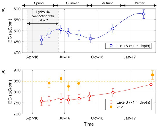 Time series of electrical conductivity (EC) at (a) Lake A (<1 m depth), and (b) Lake B (<1 m depth) and Z12. The grey shaded area represents the timing for hydraulic connection between Lake A and Lake C. Error bars (±20 µS/cm) represent the maximal expected measurement error on EC. The yellow dashed line corresponds to the mean EC value at Z12.