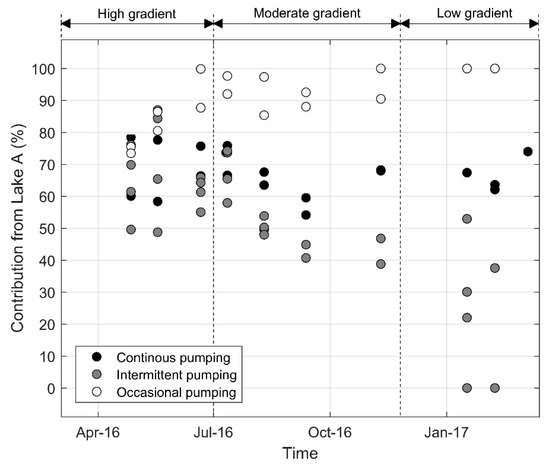 The results of the mixing model are shown in Figure 10. By considering the relative pumping rates and the estimated contributions from Lake A at each well, we calculated that 62% of the annual pumped volume originated from Lake A. The continuously pumping wells are characterized by 54% to 78% of water originating from Lake A, with the highest contributions from Lake A occurring from April to July, i.e., during the highest hydraulic gradient period. The lowest contributions from Lake A were observed from July to September, i.e., during the moderate hydraulic gradient period. This is likely related to an increase in the total pumped volume during summertime (see Section 4.1).