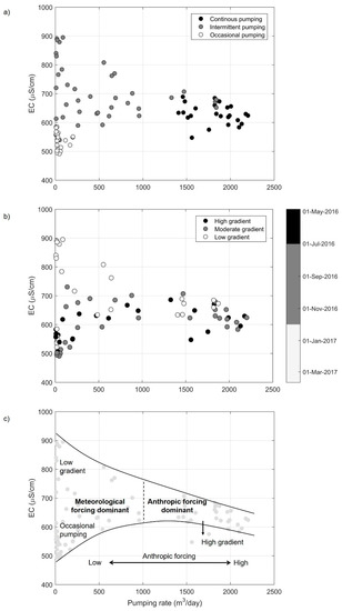 Figure 11a,b shows EC against the one-month average pumping rate prior to the sampling date. Distinction between the pumping regimes (i.e., continuous, intermittent and occasional) is illustrated in a, while hydraulic gradients between Lake A and Lake B (i.e., high, moderate, low) are represented in b. Figure 11c is a schematic representation of the dominant forcing in relation to the different hydraulic contexts. First, in Figure 11a,b, we observed little variability in EC measurements if the pumping rate was >1000 m3/day. In fact, most samples associated with high pumping rates (Figure 11a) showed EC values ranging from 583 µS/cm to 689 µS/cm, despite the variability of the hydraulic gradient (Figure 11b). Hence, for high pumping rates (i.e., >1000 m3/day), it appears that anthropic forcing is dominant over the meteorological forcing (Figure 11c). However, two samples (see downward arrow in Figure 11c) showed lower EC while being operated at >1500 m3/day. These exceptions were observed exclusively when the hydraulic gradient between Lake A and Lake B was maximal (i.e., in May and June). Under such hydraulic conditions, the anthropic forcing cannot counteract the meteorological forcing, resulting in an increase in the contribution from Lake A during springtime. Second, higher EC values (>750 µS/cm) are associated with the intermittent pumping regime, while low EC values (<600 µS/cm) are mostly related to the occasionally pumping regime (Figure 11a). For these two pumping regimes, meteorological forcing was clearly dominant over the anthropic one (Figure 11c). In fact, high EC values were strictly observed during the low hydraulic gradient period (Figure 11b). In short, this revealed that when a pumping rate of approximately 1000 m3/day is applied continuously, the mixing ratios are less variable due to direct anthropic forcing. When wells are operated only intermittently or occasionally, indirect anthropic and/or meteorological forcings control the mixing between Lake A and Lake B waters.