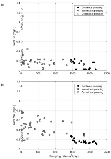The highest total Mn concentrations were concomitant with the highest fraction of Lake B water at the intermittently pumping wells. The presence of total Mn in the raw water could also be explained by the evolution of redox conditions along the flow path. Besides this, an elevated concentration in total Mn (1.06 mg/L) was measured at a 6 m depth in Lake B. As the latter was found to be geochemically stratified, relatively reduced conditions can develop in the epilimnion and promote the solubilization of Mn. Hence, it is also likely that Mn reaches the pumping wells by advective transport with water originating from the deeper zones of Lake B. Further investigation is needed to better understand the site-specific drivers of the Mn occurrence in the bank filtrate, since its mobility is controlled by numerous factors, such as travel times, temperature, pH, microbial activity, the extent of a clogging layer, and the degree of oxygen consumption [52]. Figure 12b illustrates the relationship between total Mn concentrations and the one-month average pumping rate prior to the sampling date. Total Mn concentrations decrease with higher pumping rates (for intermittently and continuously pumping wells). This suggests that pumping rate can be used as an operational tool to control the total Mn concentration in the pumped water.