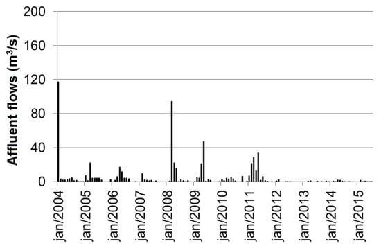 Information concerning inflow and evaporation flux of the Epitácio Pessoa Reservoir, which complements the water balance needed to realize the simulations in this study, was acquired from Nunes et al. [14]. Therefore, for inflow, a series of discharges between 2004 and 2015 was employed based on daily volume measurements (Figure 2).