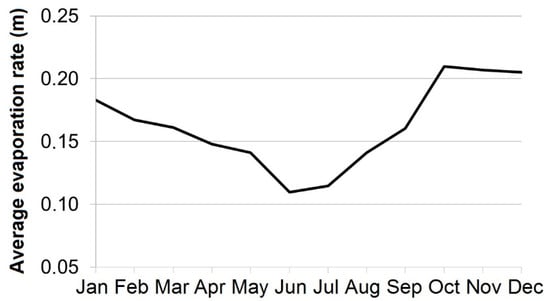 With respect to evaporation, measurement of evaporated water sheets in the Epitácio Pessoa Reservoir was non-existent. For this very reason, the mean data of monthly evaporation in a Class A evaporimetric tank were used, collected in the basin at São João do Cariri School from the Federal University of Campina Grande (UFCG). The series was considered representative due to its proximity to the reservoir, similar weather characteristics, vegetation, and terrain. Coefficients (Kp) calculated by Nunes et al. [14] were used to correct the measured values in the Class A tank. In the Epiácio Pessoa Reservoir, coefficients other than the commonly employed value of 0.7 were used seasonally, given that each season of the year brings its own climatic conditions, radiation, humidity, wind, and air temperature, among other attributes associated to the exclusive climate of each locality. The monthly averages of evaporated water sheets used in the simulations can be observed in Figure 3.