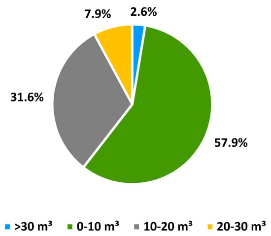 The first block (consumption ≤ 10 m3) of this tariff had two objectives: to achieve equity in access to water and to establish a minimum price that corresponded to the economic and financial sustainability of the provider responsible for the water service. If the residence exceeded 10 m3 of water consumption, for example, 12 m3, the tariff calculation was (11.16 + 2 × 1.44). This same logic applied to other consumption blocks. Figure 4 shows the distribution of households per block of water tariff. It is verified that 57.9% of the households were in the consumption block of 0 to 10 m3 and 31.6% in the block between 10 and 20 m3, which made up a total of 89.5% of the households only in these first two blocks [19].