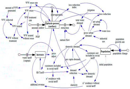 After building the causal loop diagram, the sub-models were delimited to construct the stock and flow diagram (Figure 6). The proposed diagram consisted of five sub-models: population sub-model, water supply (surface) sub-model, demand sub-model, water tariff sub-model, and reclaimed water sub-model. To avoid anomalies due to oscillations in reservoir levels, the model was designed to aggregate the monthly output on an annual simulation step.