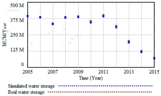 Before proceeding with the analysis of the results, the model was validated for water balance from 2005 to 2015. Thus, direct structural tests evaluated the validity of the model structure against the real system. For this purpose, we checked whether the model included all critical variables that were to be investigated.