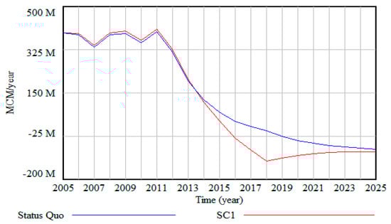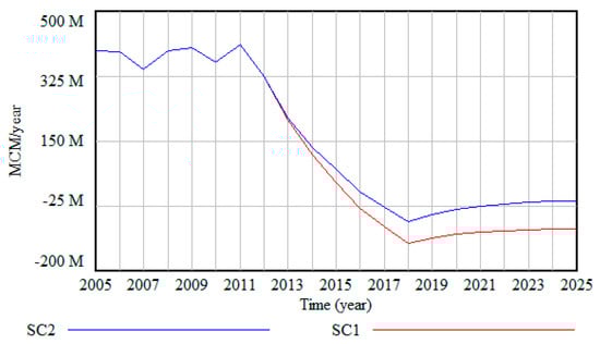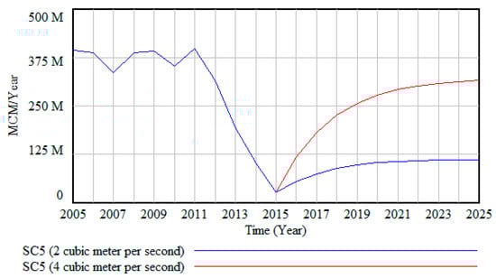 In accordance with the simulated scenarios of both flows (2 m3/s and 4 m3/s) supplied by PISF, a water collapse would be avoided in the region. In addition, the reservoir would reach to the end of the simulation period with high stocks of water and no risk of water scarcity, as is verified in Figure 10.