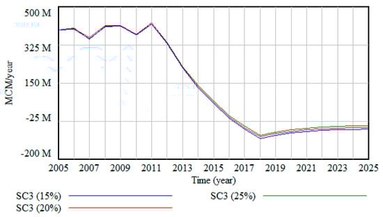 As Figure 10 shows, with the implementation of a loss-reduction policy early in the drought, a water collapse in the region would only be delayed briefly (in Scenario 1), reducing the water deficit in all scenarios of loss control throughout the simulation period. For example, for 15% efficiency in loss reduction (from the current rate of 33%), the water deficit would be reduced to 68 MCM in 2022 and 62 MCM in 2025. With respect to Scenario 1, such represents a water-deficit reduction percentage of 25% in 2022 and 31% in 2025. With 20% efficiency, the water deficit would be reduced to 60 MCM (34% reduction) in 2022 and 54 MCM (37% reduction) in 2025. In a situation rendering 25% loss (from the current rate of 33%), the water deficit would be reduced to 52 MCM in 2022 and 47 MCM in 2025. In regards to Scenario 1, these conditions would result in a water-deficit reduction percentage of 42% in 2022 and 45% in 2025. Nevertheless, it is certain that no matter how efficient the loss control in water-distribution networks could becomes, for a drought period of more than six years, such policy would not impede a water collapse in the region.
