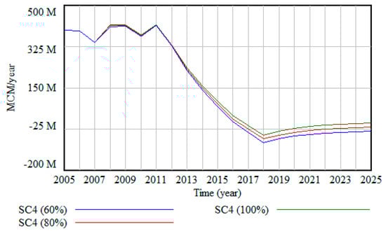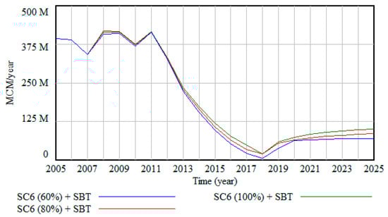 In this scenario, the impacts of water conservation through the SBT increment and wastewater reuse for purposes of irrigation were aggregated. The SBT was simulated considering three scenarios of reuse (60%, 80%, and 100%). In accordance with Figure 13, it is to be noted that, with the implementation of these two policies (demand management and supply), it was possible to reduce water scarcity during an analyzed drought period and maintain relatively high water stocks in the reservoir through the conclusion of the simulation period in all scenarios.