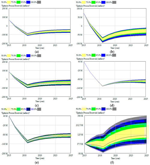 In scenarios with PISF implementation, two assumptions were made. The first being that the study simulated the scenarios with the increment of water from PISF starting from 2015. The second referred to the flows that were considered in the two scenarios, which were 2 m3/s and 4 m3/s. Such flows were admitted due to the fact that, before the water arrived to supply the Epitácio Pessoa Reservoir, it underwent a 220-km journey. In this sense, specialists affirmed that during that journey, the PISF supplied many reservoirs, occurrences of water theft by communities residing along the canal, in addition to possible water-supply interruptions for reasons of maintenance. Under such conditions, the amount of water that arrived successfully to the Epitácio Pessoa Reservoir was less than half that estimated by PISF. The simulated scenarios are presented in Figure 12.