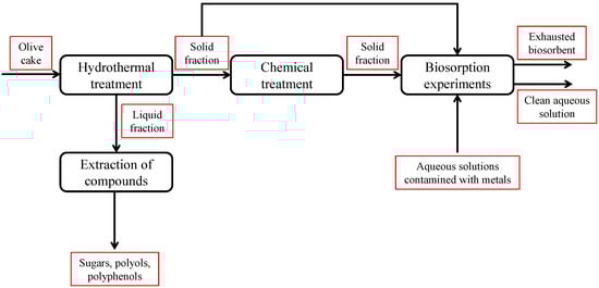 Olive cake was provided by an industrial plant that produces olive oil placed in Linares-Baeza (Jaén, Spain). The olive cake was first milled in an IKA mill, model MF10, and separated manually in different size fractions using CISA test sieves. Then, a solid of a fixed particle size was subjected to a hydrothermal treatment with water at different low temperatures for 1 hour to remove water-soluble compounds that interfere with the biosorption process. Also, the liquid fraction obtained may be valorized extracting compounds of interest include sugars, polyols, or polyphenols []. Later, the solid-liquid suspension was filtrated and the solid resulting from each test was dried and stored until its use in biosorption tests. Figure 1 shows the outline process chart, which gives an overall view of the process followed in this work.