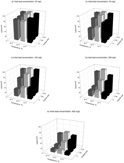 Finally, the effect of temperature was not clear. For example, at an initial lead concentration of 50 mg/L and for a high particle size, an increase of temperature showed an increase of metal removal. However, if medium or low particle sizes are observed, the increase of temperature from 50 °C to 70 °C worsens the lead removal values. This is also observed for an initial lead concentration of 25 mg/L, 100 mg/L, or 200 mg/L.