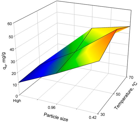 For a better explanation of the results obtained, Figure 3 shows the values of the maximum equilibrium biosorption capacity, qe (obtained for the higher concentration studied, 400 mg/L) versus temperature and particle size. Again, the results show the influence of temperature and particle size on the biosorption but now analyzed by means of equilibrium biosorption capacity. The lowest qe values were obtained for the lowest temperature and the highest particle size. As the particle size decreased and the temperature increased, in general, the values of qe increased, and the highest values were found with the smallest particle size and temperatures of 50 °C (qe = 54.46 mg/g) and 70 °C (qe = 46.32 mg/g).