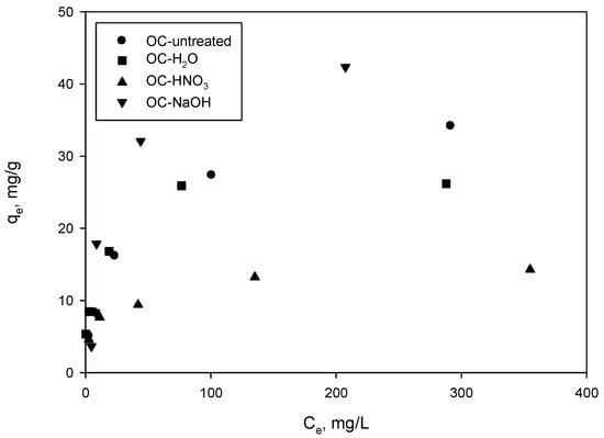 Lead equilibrium isotherms for different obtained materials (hydrolyzed olive cake, OC-untreated; hydrolyzed olive cake chemically treated by H2O, OC-H2O; hydrolyzed olive cake chemically treated by HNO3, OC-HNO3; hydrolyzed olive cake chemically treated by NaOH, OC-NaOH).
