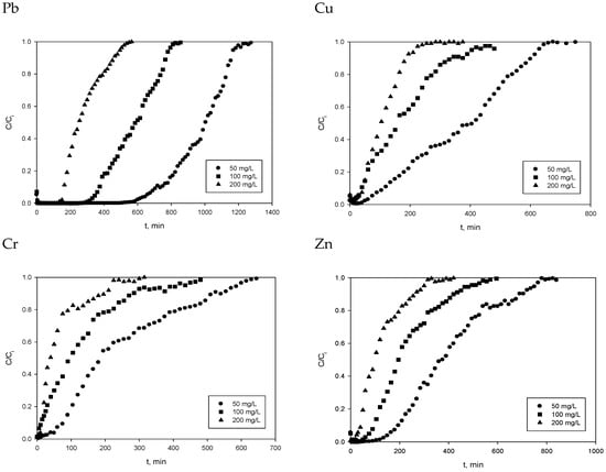 A change in the inlet metal concentration affected the characteristics of the column. For example, for lead, when the inlet concentration increased from 50 to 200 mg/L, column exhaustion was reached earlier, from 1275 to 565 minutes, respectively. For the highest concentration of metal (200 mg/L), the exhaustion of the column happened more quickly, reaching 300, 375, 565, and 450 minutes for chromium, copper, lead, and zinc, respectively. Also, at low inlet metal concentrations, the volume of solution that could be treated increased. A decrease in the inlet metal concentration caused a delay in the formation of the breakthrough curves and allowed for the treatment of a greater volume of solution, since a lower concentration gradient caused a slower transport due to the decrease of the diffusion coefficient [].