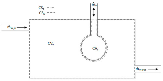 The interphase between the water and air is intended to be flexible—like a balloon—so that it is free to expand or collapse. The quantities and are the mass flow of water in and out of the CV, respectively, while is the mass flow of air (positive or negative) through the air inlet.