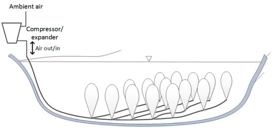 - De Jong, M. Commercial Grid Scaling of Energy Bags for Underwater Compressed Air Energy Storage. In Proceedings of the 2014 Offshore Energy & Storage Symposium, Windsor, ON, Canada, 10–11 July 2014; Available online: http://www.thin-red-line.com/140714_ThinRedLine_OSES2014.pdf (accessed on 25 October 2019).
