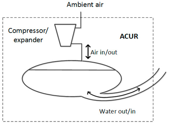 The tunnel allowing water to go in or out of the ACUR element is connected to an adjacent water reservoir. Displacing water in ACUR by admitting compressed air will give an addition to the water volume of the adjacent reservoir; vice versa, expanding air from ACUR will allow for water entering it, removing the same water volume from the adjacent water body. ACUR is simply an additional volume in which water can be stored. However, the flexibility obtained by using air to displace water is what gives the possibility of the manipulation of water levels.