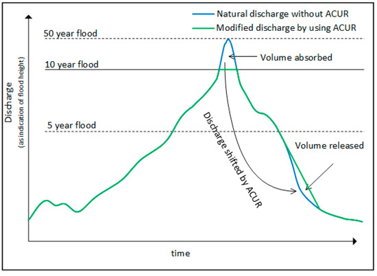 The volume needed to turn a 50-year flood into a 10-year flood is of course dependent on the flood characteristics. The duration of the flood peaks tends to be short, so it is not far-fetched to imagine a feasible volume for ACUR being able to relieve the situation. Furthermore, the periods of a flood incident in which the water retrieves rapidly might also be a concern, because an overly high hydro morphological pressure in river embankments might cause landslides. The water stored at the peak flood event could be stored and released to prevent water levels falling too rapidly, hence reducing the risk of landslides. In rivers with many tributaries, ACUR can be used to shift the time of the occurrence of the peak flow of the individual tributaries so that the flood peaks from the tributaries do not all add to the main river flood peak.