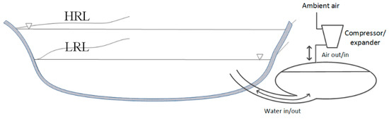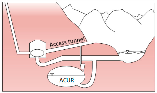 The position of ACUR below the lowest reservoir level (LRL) in Figure 6 is intentional, and the interested reader can find reasons for this in a previous paper by one of the authors [17]. In that same paper, the ACUR configuration is theoretically demonstrated, showing that the reduction in the efficiency of a pump–turbine cycle due to losses in the compressed air system is small, and that the relative reduction decreases with the increasing head of the PHS.