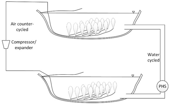 Schematics of counter-cycled water and air Pumped Hydro Storage (PHS).