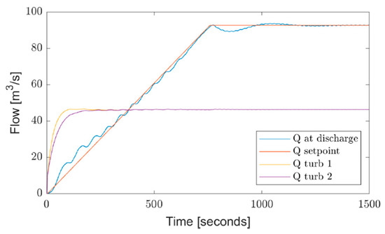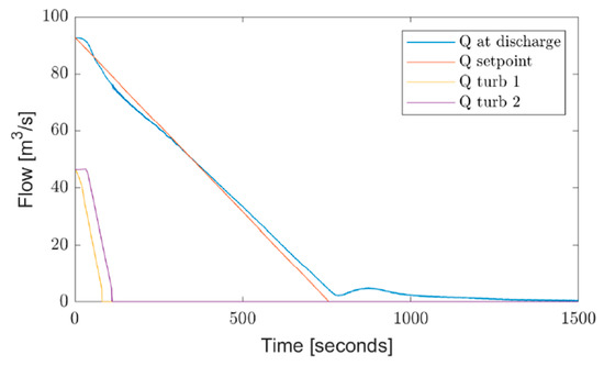 This application of ACUR is currently being investigated in the EU Horizon 2020 project HydroFlex, and the findings are that ACUR is able to smoothen the discharge well, providing the possibility of much faster ramp up/start up and ramp down/shut down of the power plants within current environmental restrictions. This can be seen in Figure 9 and Figure 10, respectively. These results are obtained from a simulation of the power plant Bratsberg [23], which has two identical units. The “Q setpoint” is the target for the governor, which is implemented to control the compressor providing an active use of the ACUR element and represents current limitations due to environmental restrictions. “Q at discharge” is the discharge into the downstream river that results from the operation of the ACUR element. As can be seen, the start-up and shut-down of the units can be performed much faster than the targeted flow due to the presence of the governed ACUR element. The ACUR technique significantly increasing the flexibility of the units. The analysis corresponds to TRL3 and is regarded as proof of concept by the authors.