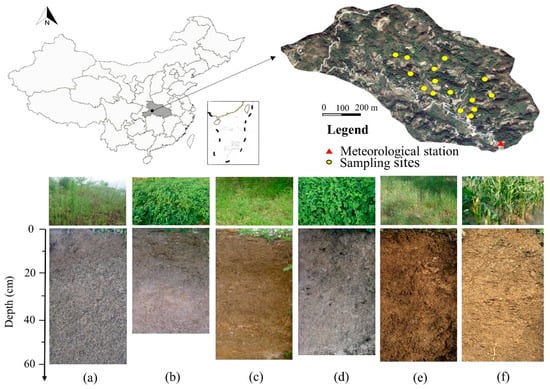 Study area and typical soil profiles of different architecture. Shallow loam sandy soil on the shoulder: (a) SLSG-grassland, (b) SLSC-cropland; shallow sandy loam on the backslope: (c) SSLG-grassland, (d): SSLC-cropland; deep sandy loam on the footslope: (e) DSLG-grassland, (f) DSLC-cropland.